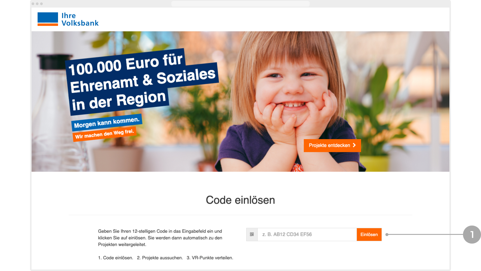 Geben Sie Ihren 12-stelligen Code in das Eingabefeld auf der Startseite ein. Mit Klick auf den „Einlösen“-Button werden Sie automatisch zur Projektübersichtsseite weitergeleitet.